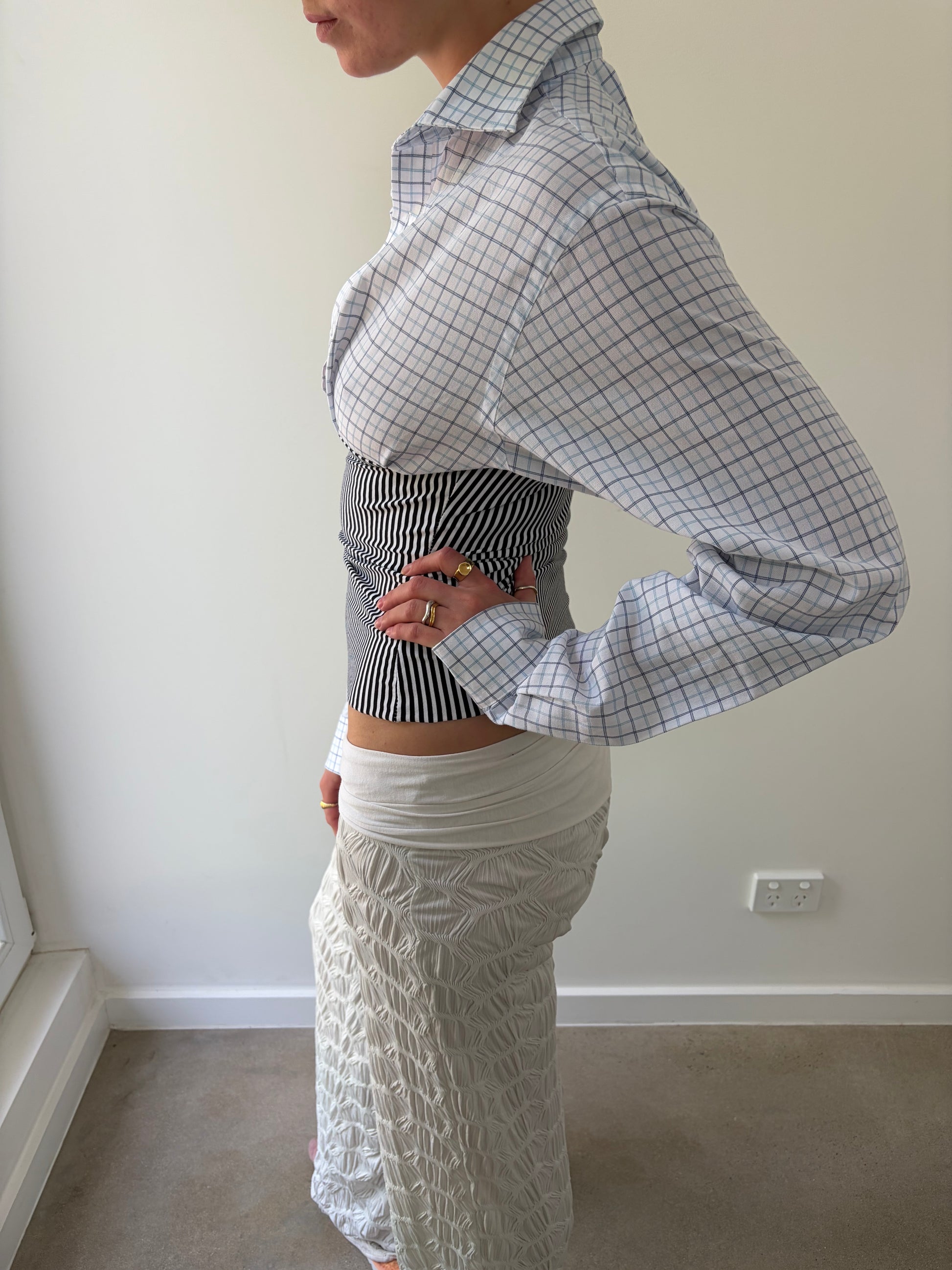 This shirt has been upcycled into a one of one design. It has a comfortable stretchy organic cotton/elastane fabric to give you a flattering hugged torso.
